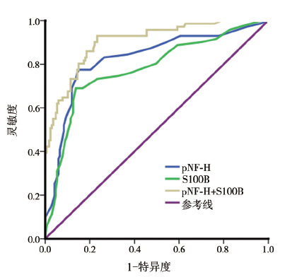 图1 血清pNF-H、S100B诊断脊柱骨折伴脊髓损伤的ROC曲线