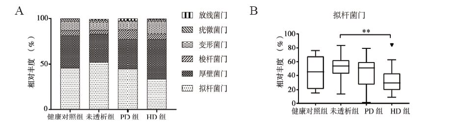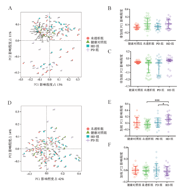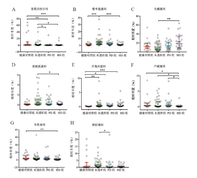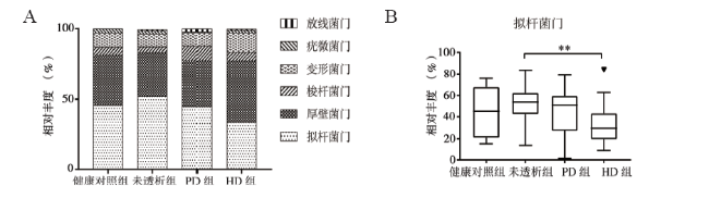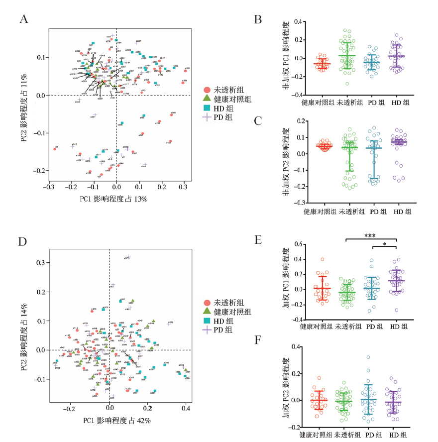 表2 健康对照组、未透析组、PD组、HD组的Observed species 、Chao1、Simpson指数比较 |