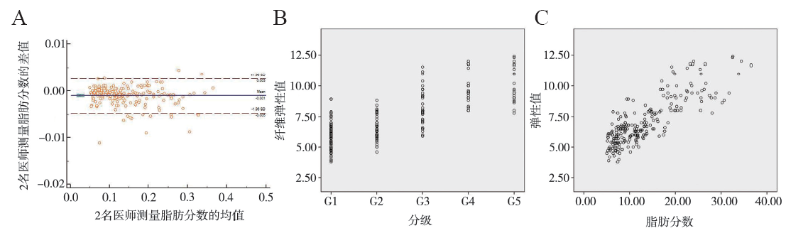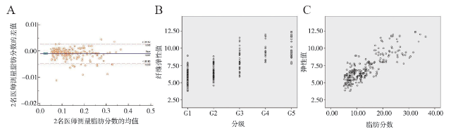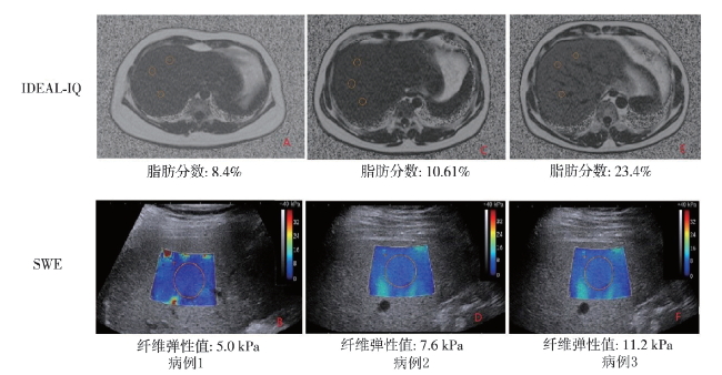 [6]。目前有研究表明在人体和动物模型中肝硬度随着肝脏脂肪浸润程度的增加而增加,但MRI定量测定的肝脏脂肪分数与肝脏纤维弹性值之间的关联尚未明确