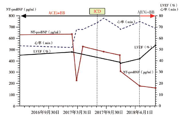 参 数 | 基线 (2014年4月1日) | ICD植入术后 (2017年12月27日) | ARNI治疗前 (2018年5月4日) | ARNI治疗后 (2018年8月6日) |