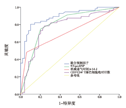 表4 联合预测因子及各影响因素对老年SCAP合并心功能不全患者机械通气撤机失败预测的AUC及其他参数估计 |