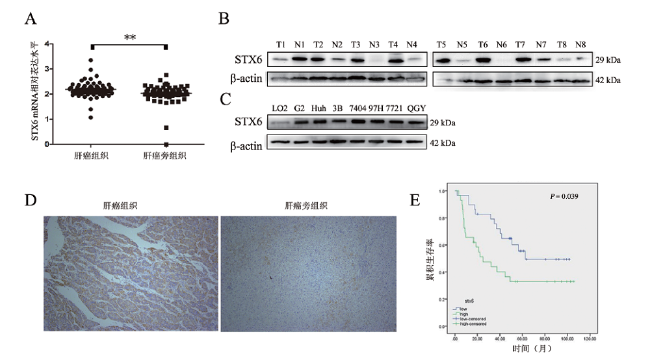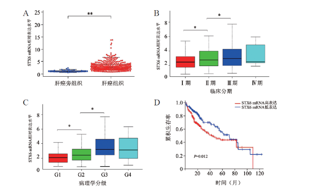 表1 58例肝癌组织STX6 mRNA表达水平与患者临床病理参数的关系[例(%)] |