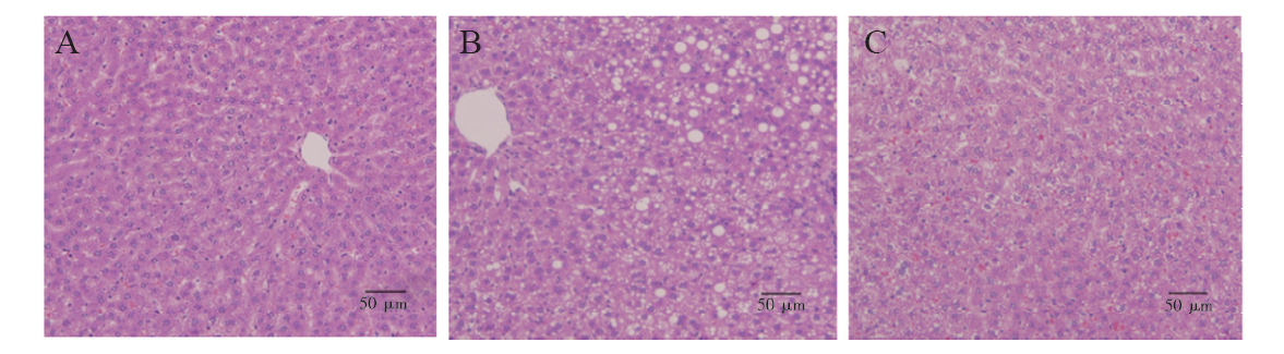 按照试剂盒说明书进行大鼠血清中ALT、AST、甘油三酯(TG)、总胆固醇(TC)含量测定。HE染色:4%的多聚甲醛固定大鼠肝脏组织,石蜡包埋后切片,之后行HE染色操作。免疫组织化学染色:①石蜡切片60℃下烘烤1 h;②脱蜡至水,二甲苯处理3次,每次5 min,无水乙醇处理3次,每次10 min,95%乙醇处理2次,每次10 min,dd H2O洗2次,每次5 min,0.01 mmol/L磷酸盐缓冲液(PBS)洗3次,每次10 min;③消除过氧化物酶体,3% H2O2溶液孵育10 min,0.01 mmol/L PBS洗3次,每次5 min;④微波抗原修复,枸橼酸钠缓冲液(pH 6.0)250 ml置于微波炉中450 W预热5 min,将组织放入缓冲液中,微波250 W加热10 min,冷却至室温,约耗时40 min,双蒸水洗3次,每次5 min,PBS洗3次,每次5 min;⑤封闭,利用5%的BSA封闭1 h;⑥打孔透膜,利用0.3%的Triton X-100孵育10 min;⑦一抗孵育,4℃湿盒孵育SREBP和FAS抗体过夜;⑧二抗孵育;⑨二氨基联苯胺(DAB)显色、苏木素复染,梯度乙醇脱水,二甲苯透明;⑩中性树胶封片和显微镜下观察结果。