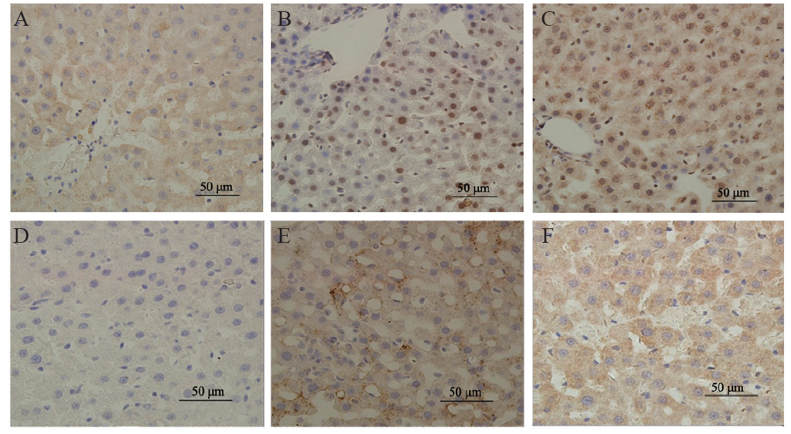 A:对照组SREBP表达;B:模型组SREBP表达;C:姜黄素组SREBP表达;D:对照组FAS表达;E:模型组FAS表达;F:姜黄素组FAS表达