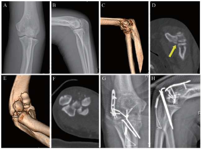 图1 陈旧性肱骨远端冠状面骨折典型病例影像学检查图A ~ D:病例1,患者女,59岁,行走时滑倒摔伤左肘,Dubberley分型为ⅡA型,早期临床症状轻而被漏诊致进展为陈旧性骨折。A、B为受伤当日正侧位X线片,仅显示肱骨远端骨质密度改变,无典型的半月影、双弧征表现,故未进一步行CT检查;C、D为受伤后23 d 的CT三维重建片,箭头处显示肱骨小头冠状面骨折,断端移位。E ~ H:病例2,患者男,38 岁,跑步时跌倒摔伤右肘,Dubberley分型为ⅢB型,因辗转多家医院而延误手术致进展为陈旧性骨折。E、F为受伤后25 d CT三维重建片,显示骨折碎裂严重,可见骨折端移位明显,肱骨远端后壁亦碎裂;G、H为术后第3日正侧位X线片,显示骨折复位良好 |