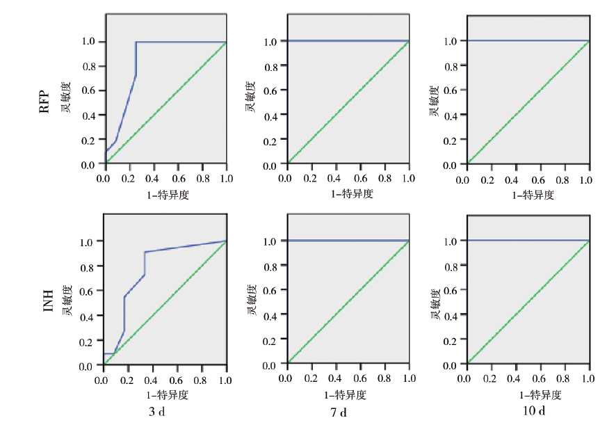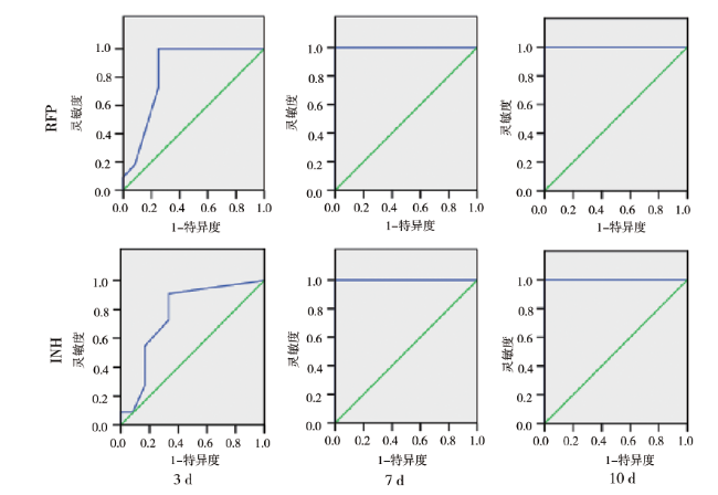 为了进一步评估GICA检测MPT64的RFP、INH药物耐药性检测效能,将该检测结果相对定量,即胶体金检测板拍照并条带灰度分析,获得灰度比值。经统计分析,我们发现培养3、7、10 d敏感株与耐多药株在RFP与INH药物培养基中MPT64检测灰度比值差异有统计学意义。然而通过ROC曲线分析,3 d MPT64检测判断RFP、INH药物耐药性的特异度偏低,分别为75%和67%;7和10 d判断该两种药物耐药性的灵敏度和特异度均为100%,以快速为目的,7 d是较为理想的检测点。34株MTB菌株GICA检测MPT64鉴定RFP和INH的耐药性,与比例法检测结果比较,配对
