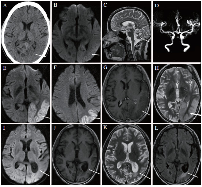 图1 一例MELAS患者的影像学检查A ~ D:发病3 d后;A:脑CT示左侧颞枕叶低密度(箭头);B:磁共振弥散加权成像(DWI)显示左侧颞枕叶高信号(箭头);C:MRI T2加权像显示小脑半球明显萎缩(箭头);D:MRA示左侧大脑后动脉远端分支较右侧增多;E ~ H:发病1周后;E:MRA示左侧大脑中动脉远端分支较右侧增多(箭头);F:左侧颞顶枕叶皮层DWI高信号,较前进展(箭头);G:增强MRI左侧颞枕叶病灶未见明显强化(箭头);H:MRI T2加权像左侧颞枕叶高信号(箭头);I ~ L:发病3个月后;I:左侧颞顶枕叶DWI等信号,左侧侧脑室后角扩大(箭头);J:MRI T1加权像左侧颞顶枕叶皮层等信号,左侧侧脑室后角扩大(箭头);K:MRI T2加权像左侧侧脑室后角局部脑组织呈高信号;L:MRI液体衰减反转恢复序列左侧侧脑室后角局部高信号,提示胶质增生(箭头) |
