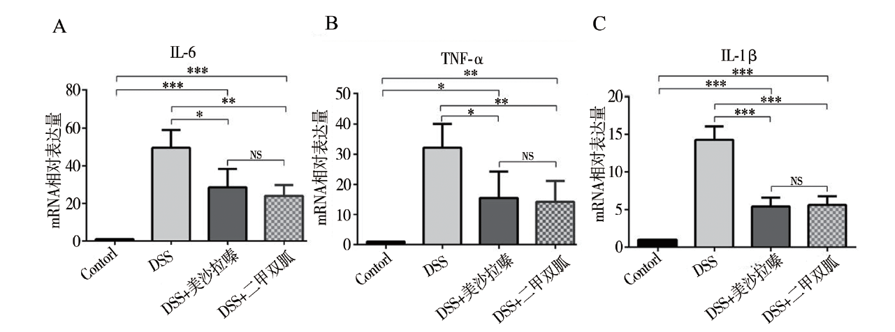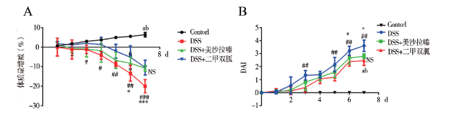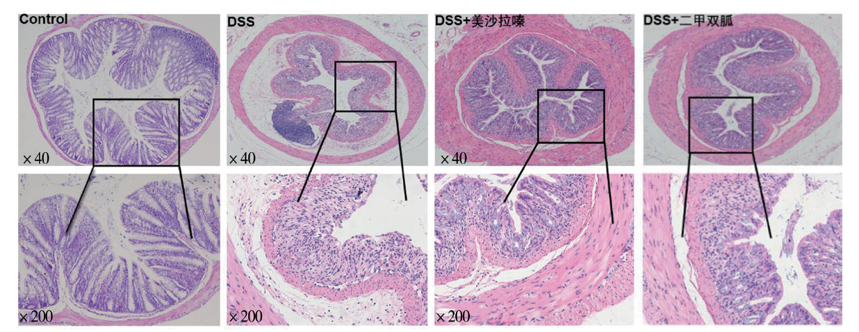 目的 探讨二甲双胍与美沙拉嗪在治疗小鼠结肠炎中的疗效差异性。方法 选取6 ~ 8周龄的C57BL/6雄性小鼠32只,随机分为Control组、硫酸葡聚糖(DSS)组、DSS+美沙拉嗪组、DSS+二甲双胍组,每组8只。Control组小鼠自由饮用高压灭菌双蒸水,并每日予0.2 ml 磷酸盐缓冲液(PBS)灌胃。采用3%DSS诱导C57BL/6雄性小鼠结肠炎模型。DSS组小鼠自由饮用3%DSS溶液,每日予0.2 ml PBS灌胃,DSS+美沙拉嗪组、DSS+二甲双胍组自由饮用3%DSS溶液,予100 mg/(kg·d) 的美沙拉嗪或100 mg/(kg·d) 二甲双胍灌胃。评估各组小鼠体质量变化、结肠长度、疾病活动指数、组织病理学改变及肠道炎症因子表达情况。结果 与DSS组相比,DSS+二甲双胍与DSS+美沙拉嗪组均可降低小鼠结肠炎所致的体质量丢失、疾病活动度评分、组织病理学评分及肠道炎症因子表达水平(P均< 0.05),但DSS+二甲双胍组与DSS+美沙拉嗪组上述指标比较差异均无统计学意义(P均> 0.05)。结论 二甲双胍可以减轻DSS诱导的小鼠结肠炎,其疗效不亚于美沙拉嗪。