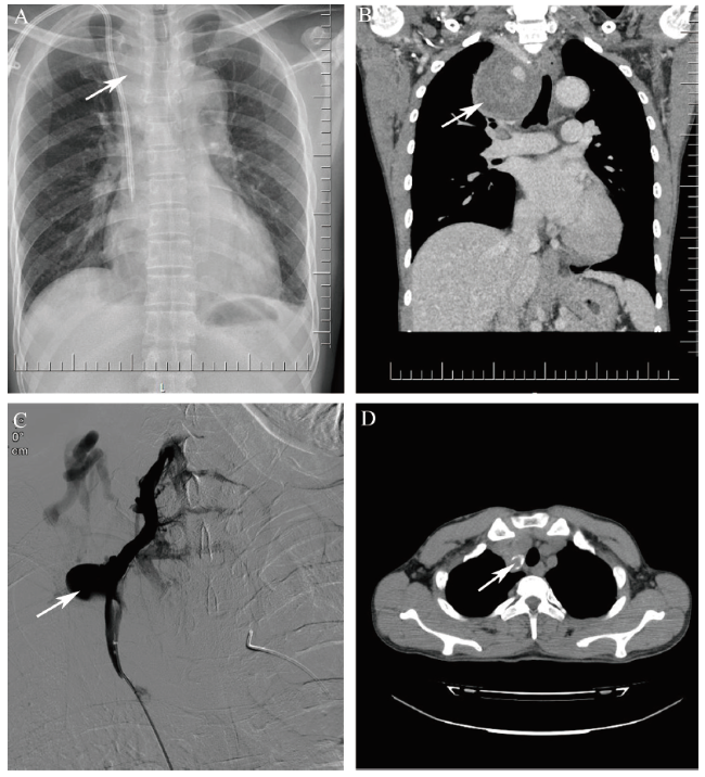 Local hematoma is a common complication secondary to central venous catheter intubation during hemodialysis. However, it is rare to have asymptomatic peri-intubation, tracheal compression and life-threatening active bleeding occur at several months after catheterization.This paper reports a 45-year-old male patient with severe active bleeding of right innominate vein and mediastinal hematoma compressing trachea 4 months after right internal jugular vein catheterization. After controlling blood pressure, reducing volume load, closing ipsilateral autogenous arteriovenous fistula, bleeding stopped and hematoma absorbed finally.This case suggests that extensive attention should be paid to the possibility of mediastinal hematoma caused by deep vein catheterization injury. Especially if the puncture is not successful, chest X-ray, CT scan or ultrasound examination should be performed immediately to reduce the risk of missing diagnosis and misdiagnosis.