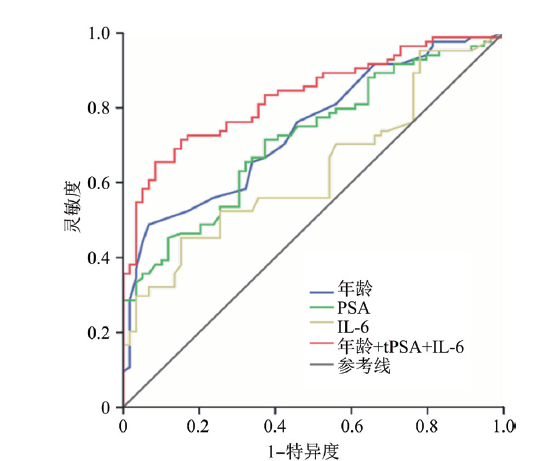 | 年龄+tPSA+IL-6 | 0.584 | 71.4 | 84.7 | 0.561 | 0.832 | 0.767~0.897 | <0.001 |