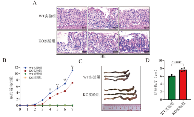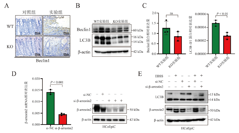 [21]。为此,我们在实验中先探究了小鼠急性UC模型中自噬水平的变化,通过蛋白免疫印迹、免疫组织化学等检测方法,发现诱导小鼠急性UC后,自噬相关蛋白的表达水平上调。而β-arrestin2的缺失可以改善小鼠结肠黏膜的炎症,于是我们进一步探究β-arrestin2是否可以通过调控自噬来调节肠道的炎症。因此我们分析了β-arrestin2 WT小鼠和β-arrestin2 KO小鼠在急性UC模型中自噬水平的变化,结果发现β-arrestin2的缺失可以抑制自噬的发生,进一步在人源性的结肠上皮细胞HCoEpic中进行验证。通过饥饿诱导细胞自噬的发生,发现沉默β-arrestin2表达的细胞中,自噬相关蛋白表达水平下降,自噬水平受到抑制。
