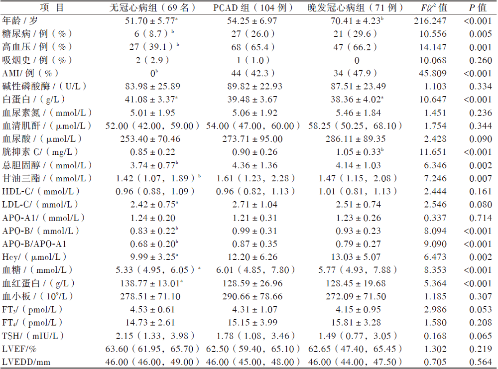 表1 无冠心病组、PCAD组与晚发冠心病组的各临床指标比较 |