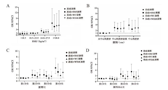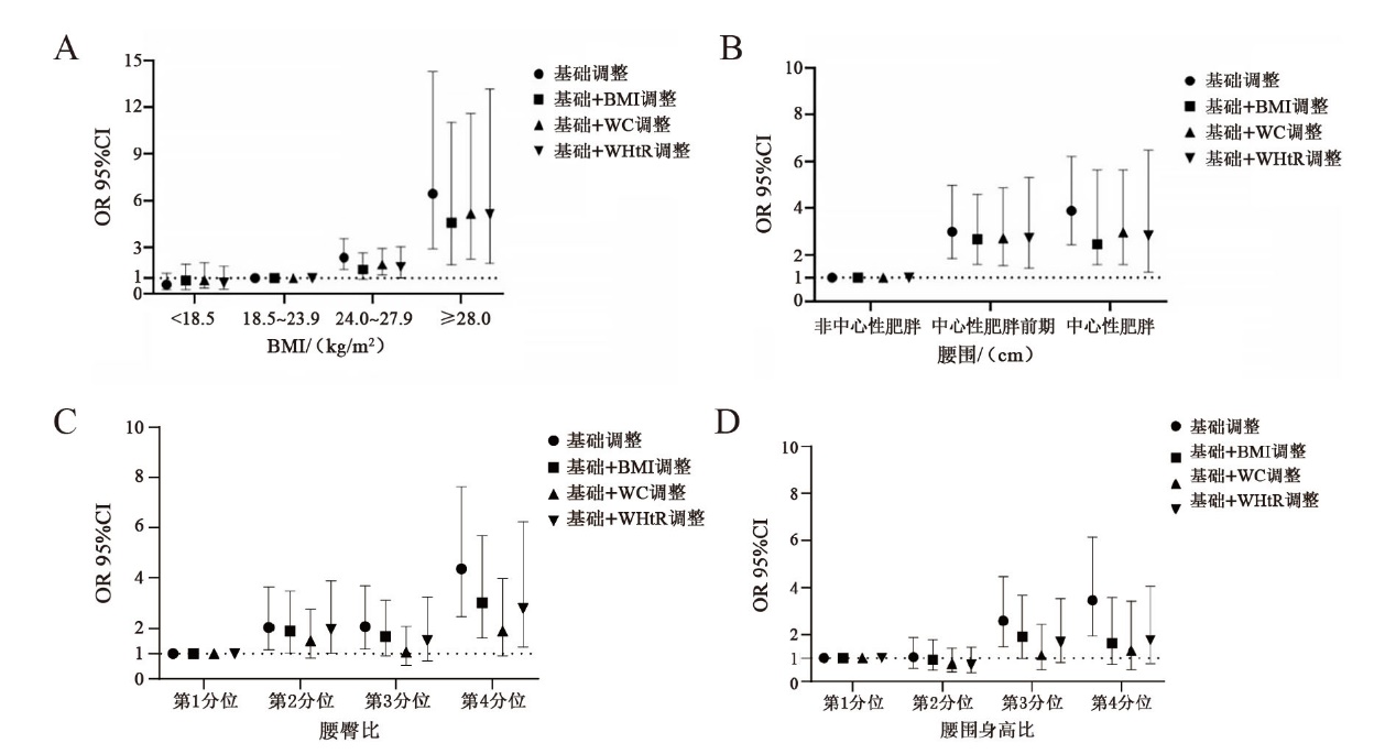 | WC | 非中心性肥胖 | 中心性肥胖前期 | 中心性肥胖 | 2.01(1.59,2.53) | |