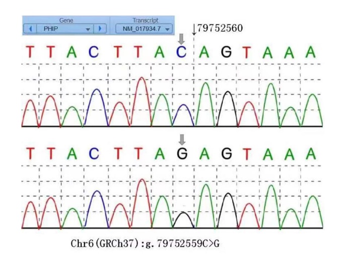 表1。复查睾丸彩超提示双隐睾,睾丸位于双侧腹股沟区,左侧大小约17 mm×9 mm,右侧大小约18 mm×8 mm,随呼吸上下游走,可部分进入阴囊。嗅觉测试存在轻度嗅 觉障碍,初步诊断为低促性腺激素性性功能减退症,给予肌内注射人绒毛膜促性腺激素(HCG)治疗。双侧乳腺彩超提示乳核可见,右侧大小约7 mm×4 mm,左侧大小约6 mm×5 mm。颅脑MRI未见异常。综上,患儿表现为异常的体质量增加、生长发育迟缓、低促性腺激素性性功能减退症、双隐睾及左肾缺如,高度怀疑患儿存在基因缺陷疾病,在取得患儿父母同意的情况下,对患儿及其父母抽血进行全外显子组基因测序。结果显示,患儿PHIP基因有1个杂合突变,该突变位点位于6号染色体PHIP基因内含子区域的一处杂合位点变异(g.79752559C>G),为点突变,其父母该位点均为正常基因型,该突变可能影响mRNA的编辑加工和表达,见