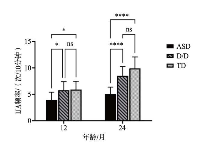 表3 ASD、D/D和TD组12月龄和24月龄感觉处理分数与IJA频率的相关分析Table 3 Correlation analysis of sensory processing scores and IJA frequency at 12 months and 24 months of age in ASD, D/D and TD groups |