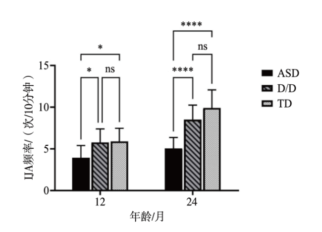 表4 ASD、D/D和TD组12月龄感觉处理分数与24月龄IJA频率的偏相关分析Table 4 Partial correlation between sensory processing scores at 12 months of age and IJA frequency at 24 months of age in ASD,D/D and TD groups |
