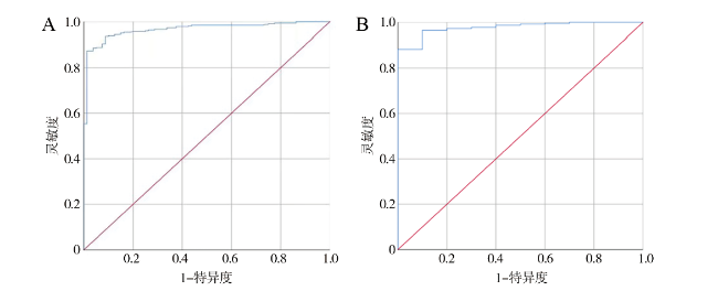 图1 肾恶性肿瘤患者行肾部分切除术前48 h内血清肌酐变化值预测AKI和AKI 2期的ROC曲线注: A为肾部分切除术患者术前48 h内血清肌酐变化值出现AKI预测的ROC曲线 (非AKI vs. AKI 1期+AKI 2期);B为肾部分切除术患者术前48 h内血清肌酐变化值出现AKI 2期预测的ROC曲线(非AKI+AKI 1期 vs. AKI 2期)。 Figure 1 The ROC curve of changes in serum creatinine levels during 48 hours before partial nephrectomy in patients with renal malignancies for predicting AKI and stage 2 AKI |