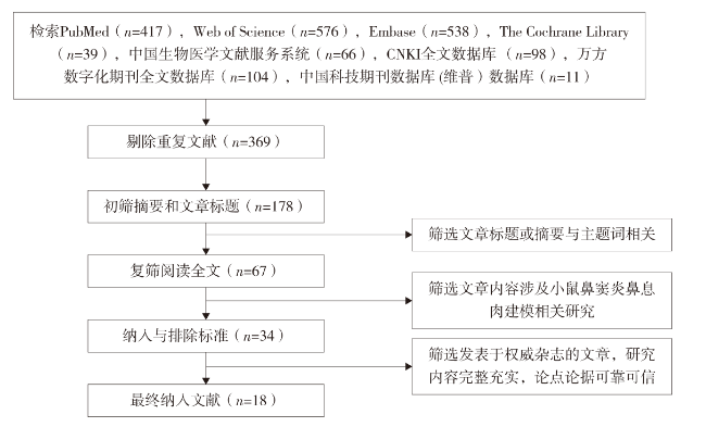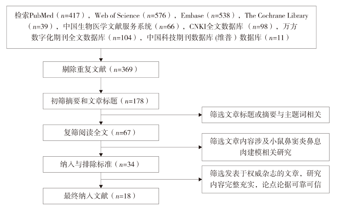 纳入标准:①文章标题或摘要与主题词相关;②文章内容涉及小鼠鼻息肉建模相关研究;③发表于权威杂志的文章;④研究内容完整充实,论点论据可靠可信。