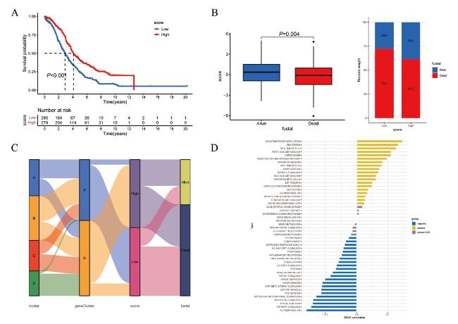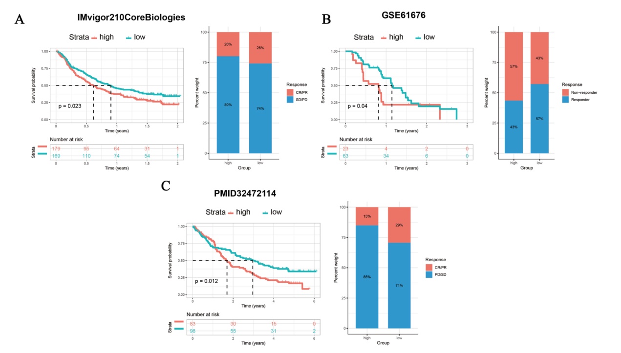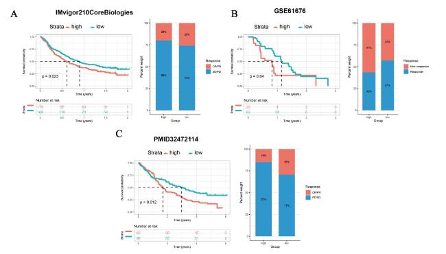 图9 免疫治疗预测注:A为PD-L1抑制剂atezolizumab治疗BLCA患者的IMvigor210队列预测高、低LactyScore组患者对免疫治疗的潜在反应;B为bevacizumab+erlotinib联合靶向治疗NSCLC的GSE61676队列预测高、低LactyScore组患者对免疫治疗的潜在反应;C为PD-1抑制剂nivolumab对肾透明细胞癌(clear cell renal cell carcinoma,ccRCC)的治疗预测高、低LactyScore组患者对免疫治疗的潜在反应。 Figure 9 Immunotherapy prediction |