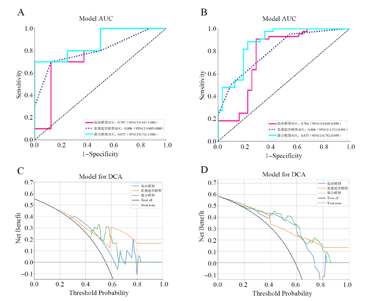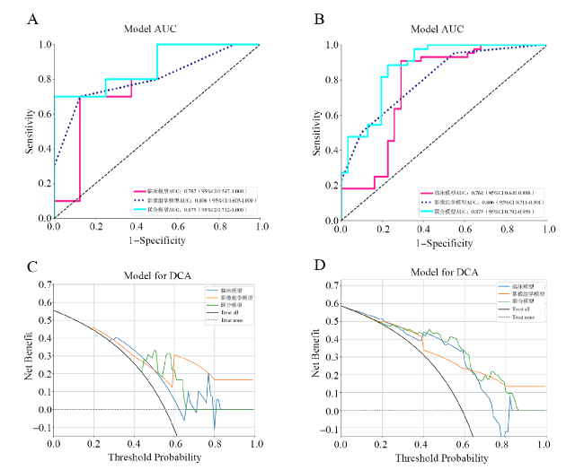 图1 临床模型、超声影像组学模型、联合模型诊断表现注:A、C为训练组,B、D为验证组。 Figure 1 Diagnostic performance of the clinical model, ultrasound radiomics model and joint model |