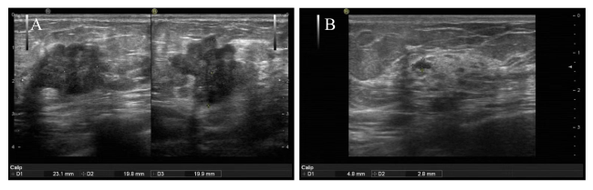 图2 一例联合模型预测乳腺癌NAC患者pCR注:A为NAC前乳腺癌病灶,B为NAC 3个周期后乳腺癌病灶;患者女,55岁,NAC前病灶大小约23.1 mm×19.8 mm×19.9 mm,联合模型预测达到pCR概率为0.857,在接受NAC 3个周期后,病灶大小4.8 mm×2.8 mm,达到pCR。 Figure 2 Joint model for predicting pathological complete response in one case of breast cancer patient after neoadjuvant chemotherapy |