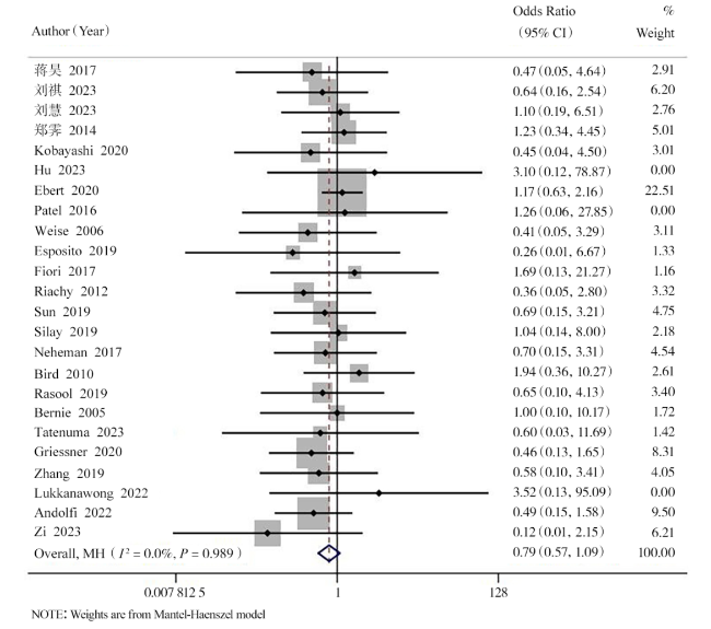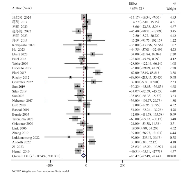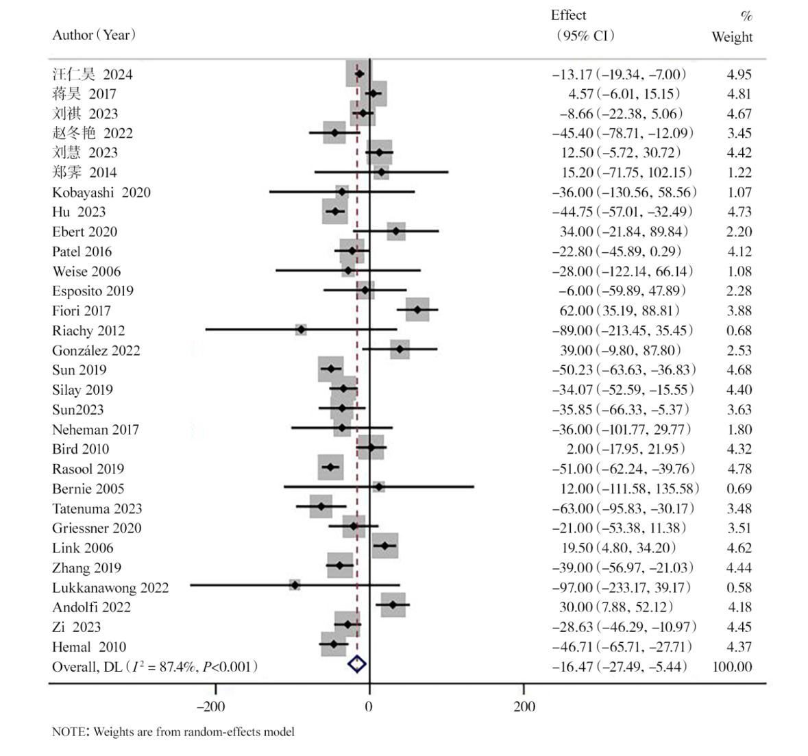 郑霁[17] | 2014 | 中国 | 32/46 | 28.90±35.56 | 29.80±41.48 | 20/12 | 30/16 | 否 | ①②③④⑤ | 20 | |