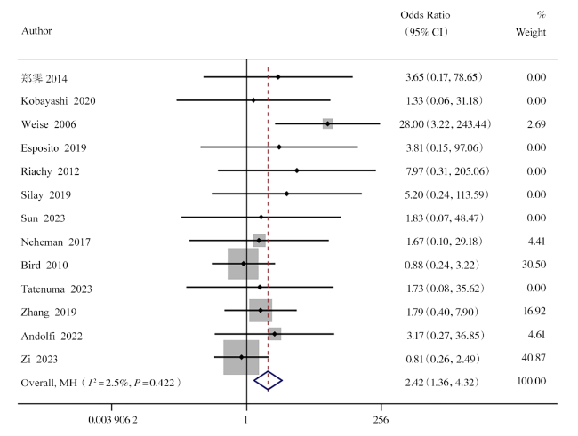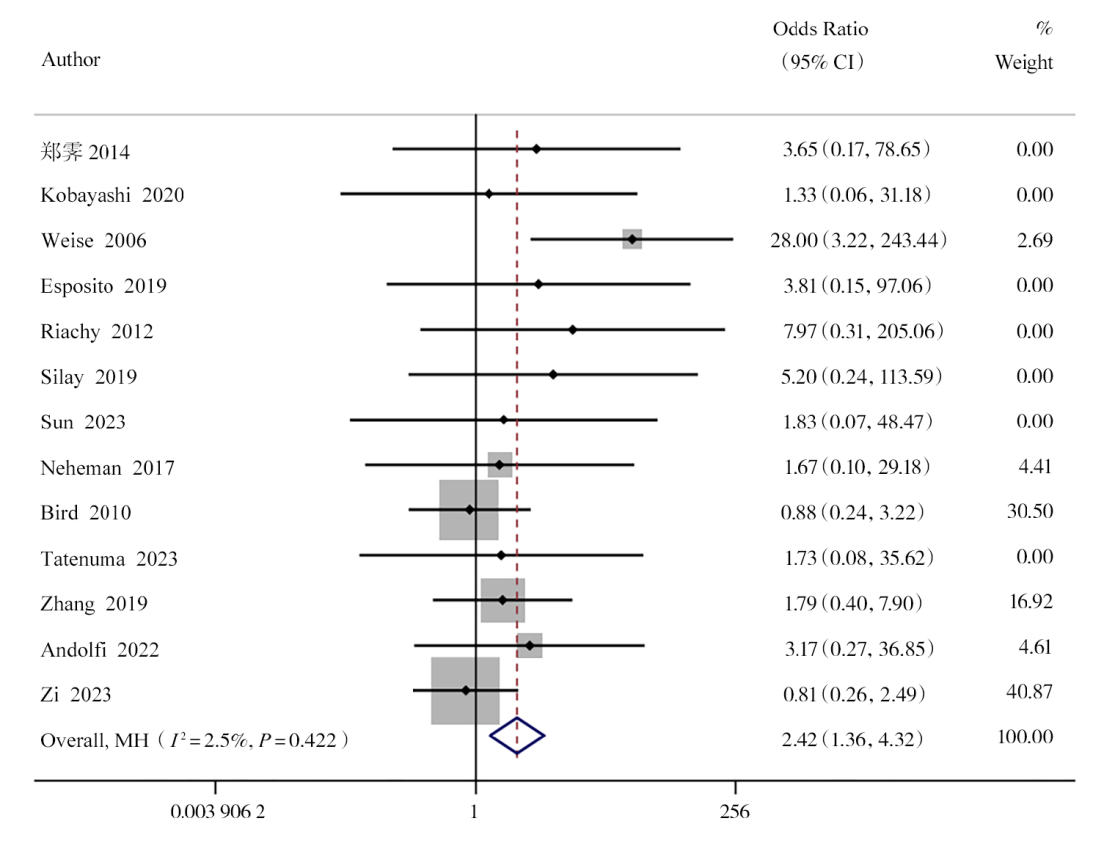 Weise[22] | 2006 | 美国 | 31/14 | 26.00±37.04 | 24.50±41.48 | 13/18 | 6/8 | 否 | ②③④⑤ | 21 | |