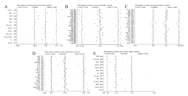 注:RALS组为机器人组,OL组为传统腹腔镜组;①术中出血量,②手术时间,③住院时间,④并发症,⑤成功率,⑥引流管留置时间,⑦术中吻合时间,⑧输尿管支架留置时间,⑨术中缝合时间,⑩住院费用,⑪二次手术;aRCT采用RoB 2评估偏倚风险,非RCT采用MINORS量表评估方法学评分。 |