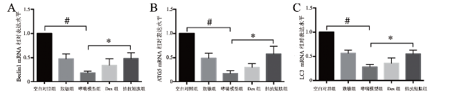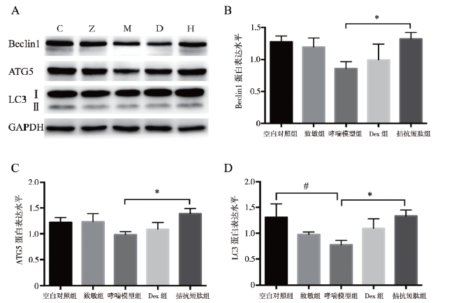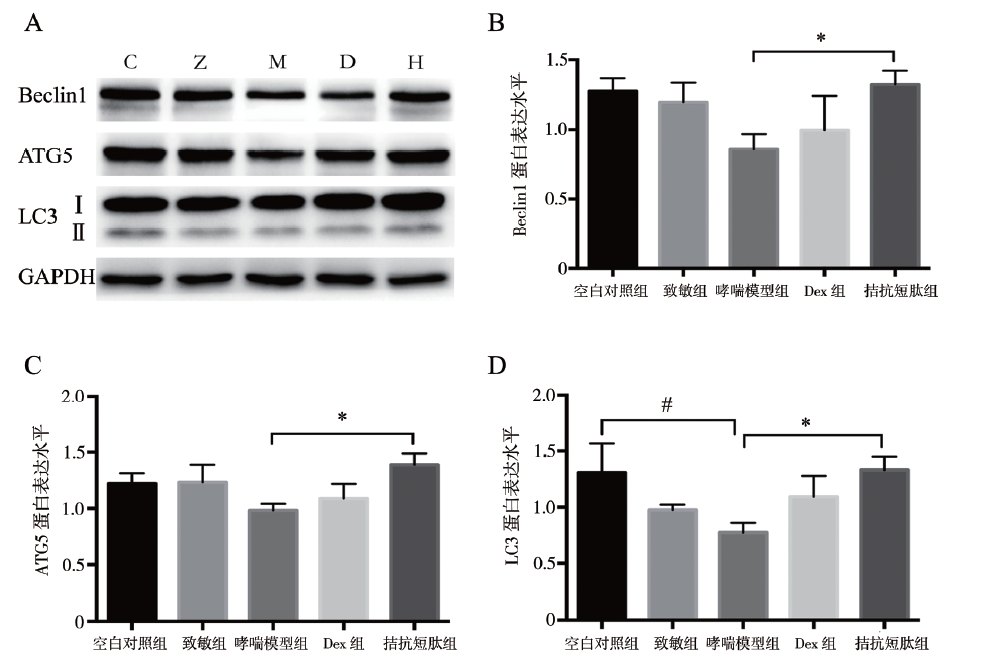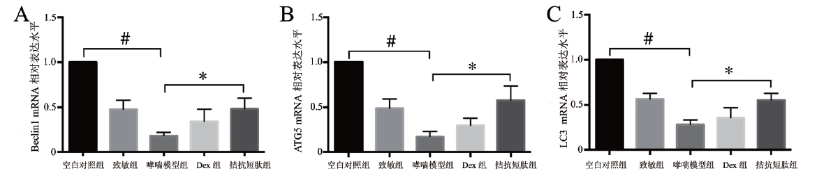 Objective To investigate the effects of antagonistic peptide specifically binding to the second extracellular membrane loop of CC chemokine receptor 5 (CCR5) on the expression levels of autophagy-related genes, such as Beclin1, ATG5, LC3 and the formation of autophagosomes in the lung tissues of asthmatic mice. Methods Forty BALB/c mice were randomly assigned into five groups (n = 8). In the blank control group, the mice were sensitized by intraperitoneal injection of normal saline and induced by nasal drops of normal saline. In the sensitization group, the animals were sensitized by ovalbumin (OVA) and induced by normal saline. In the asthmatic model group, the mice were sensitized and induced by OVA. In the dexamethasone sodium phosphate (Dex) group, the mice were treated with caudal injection of Dex after they were sensitized and induced by OVA. In the antagonistic peptide group, the mice were treated with caudal injection of antagonistic peptide after they were sensitized and induced by OVA. The levels of autophagy in the lung tissues were assessed by real-time PCR, Western blot and transmission electron microscope (TEM). Results In the asthmatic model group, the expression levels of Beclin1, ATG5, LC3 mRNA and LC3 protein were significantly down-regulated than those in the blank control group (all P<0.05). In the antagonistic peptide group, the expression levels of Beclin1, ATG5, LC3 mRNA and protein levels were remarkably up-regulated compared with those in the asthmatic model group (all P<0.05). TEM demonstrated that the quantity of autophagosomes in the lung tissues of the asthmatic mice was less than that in the blank control group. The autophagosomes were primarily distributed in the typeⅡ alveolar epithelial cells with immune function. The quantity of autophagosomes in the antagonistic peptide and Dex groups was larger than that in the asthmatic model group. However, a majority of the autophagosomes were immature and mainly distributed in the type Ⅱ alveolar epithelial cells.Conclusions Autophagy dysfunction exists in the asthmatic mice. The specific binding of antagonistic peptide to the second extracellular membrane loop of CCR5 effectively up-regulates the expression levels of autophagy-related genes, such as Beclin1, ATG5 and LC3 in the lung tissues of asthmatic mice.