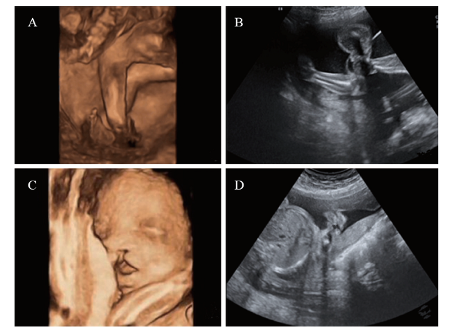 [4]。颅脑扫查时将探头置于抬头一侧,声束垂直脑中线,扫查颅脑横切面至丘脑水平。自颅骨顶部至颅底连续横切面连续扫查,观察颅骨连续性,是否椭圆形,是否左右对称。胎儿颜面部扫查时于冠状切面将双顶径平面旋转90 °,显示骨性眼眶和前额、面颊、眼及眼睑、鼻、唇、下颌,于横切面(双顶径切面)显示双侧眼眶、鼻骨、上牙槽骨、下牙槽骨、下颌,矢状切面显示鼻尖、鼻柱及鼻骨和下颌。胎儿脊柱扫查时观察脊柱矢状切面,怀疑脊柱异常时,增加观察脊柱冠状切面和横切面,并观察颅后窝池及小脑形态、颈椎和尾侧的腰椎。上肢扫查观察胎儿胸腔两侧肱骨短轴切面,于纵切面显示肱骨长轴切面并测量其长度;连续性追踪扫查前臂尺、桡骨纵切面;向前臂末端扫查,显示出手腕、手掌回声,并观察手的姿势及关节的位置关系。下肢横切面扫查双侧股骨短轴切面,纵切面显示股骨长轴切面并测量其长度,连续性追踪扫查胫、腓骨长轴切面、横断面,扫向踝关节,观察足的形态及足与小腿的位置关系,最后观察脚掌回声。