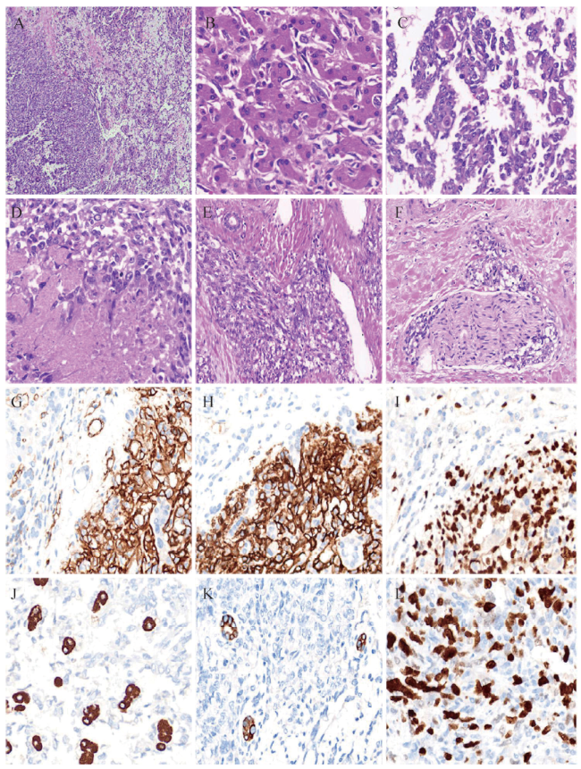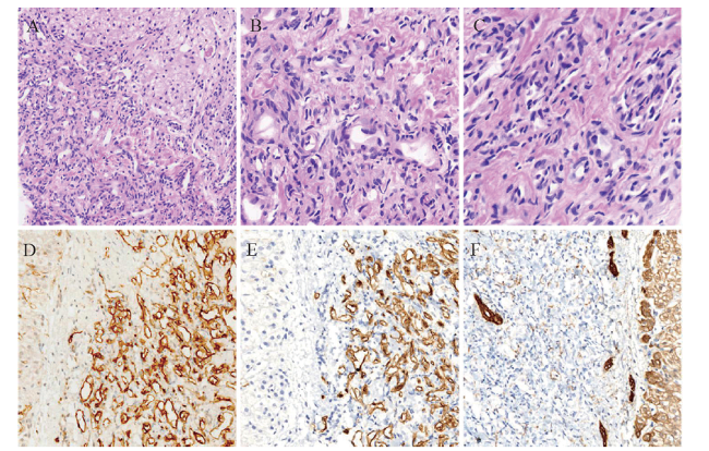 图2 一例IHHE恶变为血管肉瘤患儿肝移植术切除肿物病理形态及免疫组化A:左侧为血管肉瘤区域,右侧为IHHE区域(HE染色,×100);B、C:IHHE区域,显示肿瘤形成迷路样血管腔隙,衬覆扁平或立方细胞,穿插于肝窦之间,细胞有一定异型性(HE染色,×400);D ~ F:血管肉瘤区域,肿瘤由梭形或圆形细胞构成,部分可见胞浆内空泡,细胞异型性明显,核分裂易见,可见多灶性坏死,并见神经侵犯(D为HE染色,×400;E、F为HE染色,×200);G ~ L:分别为CD31、CD34、ERG、Hep、CK7及Ki67免疫组化结果,肿瘤细胞血管源性标记CD31、CD34、ERG均强阳性,肿瘤内残存小胆管及肝细胞均阴性,肿瘤细胞Hep、CK7阴性,肿瘤内残存肝细胞Hep阳性,残存小胆管CK7阳性,Ki67热点区域约40%阳性(×400) |