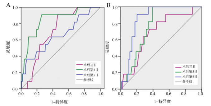 ROC曲线显示,术后第3日腹腔引流液中降钙素原水平和术后第5日CRP水平对预测术后吻合口瘘的发生具有较高的准确性,其对应的AUC最大,分别为 0.845(与术后当日比较Z = 2.262、P = 0.024,与术后第5日比较Z = 2.444、P = 0.015)、0.855(与术后当日比较Z = 2.391、P = 0.017,与术后第3日比较Z = 2.151、P = 0.032),灵敏度分别为0.835、0.875;特异度分别为0.762、0.773,术后第3日腹腔引流液中降钙素原水平和术后第5日CRP水平预测术后吻合口瘘的AUC比较差异无统计学意义(Z = 1.063,P = 0.288),见图1表4