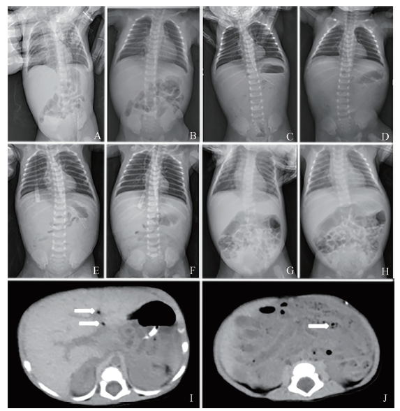 神情疲倦,肤色较苍白,全身可见花斑纹,心率增快,呼吸不促,无发绀,腹软,肠鸣音存在,肢端凉,急查腹部立位及卧位片提示“NEC、肠穿孔?”,见图1C、D,考虑诊断为NEC、肠穿孔、感染性休克,予禁食、胃肠减压、生理盐水扩容、升级抗生素[美罗培南 20 mg/kg、每8 h 1次,青霉素30 U/(kg·d)],请小儿外科专家会诊,拟继续予保守治疗。加予补液、止血、输注血浆等处理后,患儿生命体征恢复稳定,精神反应好转,肤色转红润,全身花斑纹基本消退。住院第5日复查腹部立位及卧位片示立位膈下未见明显游离气体影,门脉积气及肠壁积气较前减少,小肠腔内积气较前增多,见图1E、F;腹部CT提示肠管普遍性积液,肠壁稍厚,门脉左支及其分支多发积气,拟NEC可能,见图1I、J。住院第6日患儿脑脊液检查未见异常,监测其生命体征平稳,精神反应好转,无发绀,腹软,肠鸣音正常,肢端暖和,胃肠引流出草绿色液体较前减少,临床症状逐渐好转。经禁食及抗生素治疗14 d后停用抗生素,重新开始喂养不含乳糖奶,患儿无腹胀、呕吐,住院第26日复查腹部立位及卧位片无异常,见图1G、H,住院第28日出院,按需喂养不含乳糖奶。出院诊断:NEC并肠穿孔、感染性休克;新生儿黄疸、新生儿贫血。患儿出院后我科收到粪便逆转录PCR(RT-PCR)结果:住院第2日、第23日粪便 CV A6阳性,补充诊断:新生儿CV感染。患儿出院后1个月、3个月、6个月及1年的门诊定期复诊结果均显示其体质量、身长达标,生长发育情况良好。