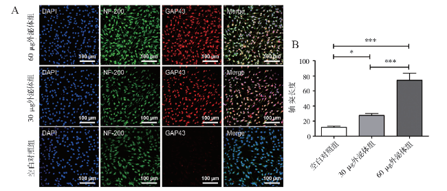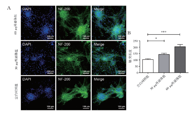 Objective To explore the effect of bone marrow mesenchymal stem cell exosomes on the regeneration of nerve axon. Methods Sprague Dawley (SD) rat bone marrow mesenchymal stem cells were extracted and identified by cell morphology and flow cytometry. Exosomes in the cell supernatant were extracted by ultracentrifugation and identified by transmission electron microscopy, particle size and Western blot. PC12 cells and neural stem cells extracted from SD rats were cultured. PC12 cells were divided into the blank control, 30 μg exosome and 60 μg exosome groups. The phagocytosis of target cells was observed by fluorescently-labelled rat exosomes. The axon growth of PC12 cells and neural stem cells was observed by immunofluorescent staining. The expression levels of NF-200 and GAP43 proteins were detected by Western blot. Results Cell morphology and flow cytometry confirmed the successful extraction of rat bone mesenchymal stem cells. Transmission electron microscopy, particle size and Western blot validated the successful extraction of bone marrow mesenchymal stem cell exosomes, which could be taken up by nerve cells to promote the axon growth of PC12 cells and neural stem cells and up-regulate the expression level of axon protein. The promoting effect was strengthened as the increasing amount of exosomes. The axon length and the expression level of axon protein in the PC12 cells and neural stem cells significantly differed among three groups (all P < 0.001). Conclusion Bone marrow mesenchymal stem cell exosomes play a role in repairing nerve injury by promoting the regeneration of nerve axon.