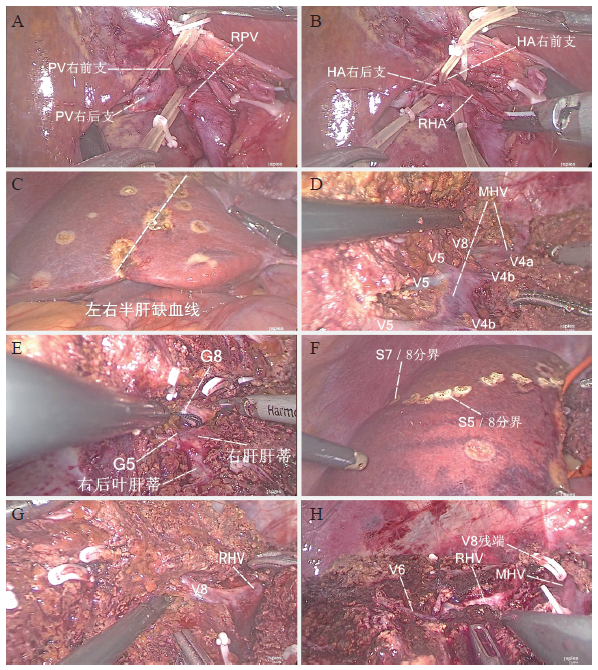 图1 腹腔镜经正中裂入路解剖性肝Ⅷ段切除术主要步骤A:鞘内解剖出门静脉的右前、右后支,门脉右前支留置预阻断带(PV为门静脉,RPV为门静脉右支);B:鞘内解剖出肝动脉的右前、右后支,肝动脉右前支留置预阻断带(HA为肝动脉,RHA为右肝动脉);C:同时阻断右前门静脉和右前肝动脉可显露缺血线,并予电凝标出左右半肝缺血线;D:在左右半肝缺血线的右侧由浅至深、由下往上劈开肝脏,显露肝中静脉Ⅴ段属支,沿肝中静脉Ⅴ段属支向上解剖,显露肝中静脉主干全程及其属支(MHV为肝中静脉,V4a为S4a段回流静脉,V4b为S4b段回流静脉,V5为S5段回流静脉,V8为S8段回流静脉);E:在肝中静脉Ⅴ段属支的下方找到右前叶肝蒂主干,在分叉处上方显露Ⅷ肝蒂并于根部结扎Ⅷ段肝蒂(G5为S5段肝蒂;G8为S8段肝蒂);F:结扎Ⅷ肝蒂后,标记S5/8、S7/8分界缺血线;G:沿S5/8段缺血线自左离断肝实质,至右肝静脉主干,再沿肝右静脉根部从头侧向尾侧离断肝实质,显露V8回流至右肝静脉分支并结扎离断(RHV为右肝静脉);H:沿下腔静脉的腹侧面、RHV和MHV主干之间完整切除Ⅷ段(MHV为肝中静脉,V6为S6段回流静脉) |