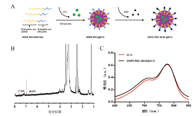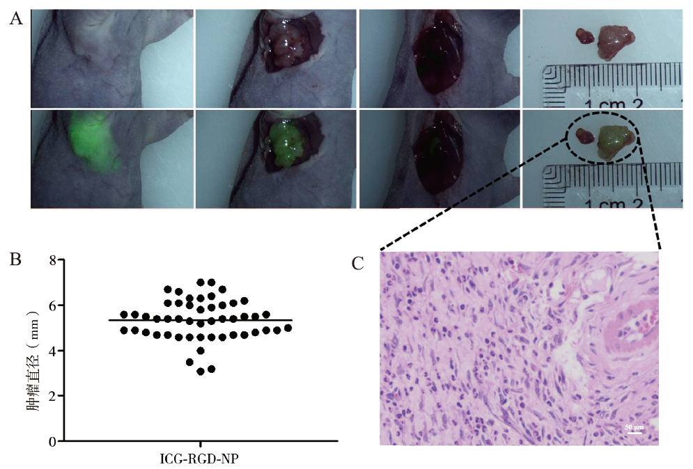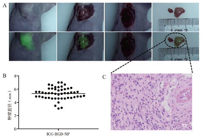 Objective To synthesize a gastric cancer-specific nanoparticle and to explore the value of the nanoparticle in accurate diagnosis and complete resection of gastric cancer under the guidance of self-built near-infrared fluorescence laparoscopy. Methods Indocyanine green (ICG) was encapsulated into the amphiphilic polymer distearyl phosphatidylethanolamine-polyethylene glycol-Maleimide (DSPE-PEG-Mal) by self-assembly method. And the surface of the polymer was modified with arginine-glycine-aspartic acid polypeptide (RGD) to prepare targeted nanoparticles DSPE-PEG-RGD@ICG. The product was verified by NMR and the optical properties were detected by absorption spectrum. The gastric cancer mouse models with subcutaneous tumors were established, and the tumors were detected and resected under self-built near infrared fluorescence laparoscopy. Results The NMR spectra showed that the product was consistent with the expected product and showed a similar absorption spectra to free ICG. In in vivo experiment, DSPE-PEG-RGD@ICG could specifically target gastric cancer and guide the complete resection of tumors. At 4 h after intravenous administration, the location of tumors could be clearly displayed by fluorescence laparoscopy. The detection rate of subcutaneous tumors in gastric cancer mouse models was 91.8%, and the minimum diameter of detected tumors was 4.9 mm. Conclusions The successfully prepared nanoparticles targeting gastric cancer have optical properties similar to that of ICG, which can effectively assist surgeons in the complete resection of subcutaneous tumors in gastric cancer mice under the guidance of self-built fluorescence endoscopy system.