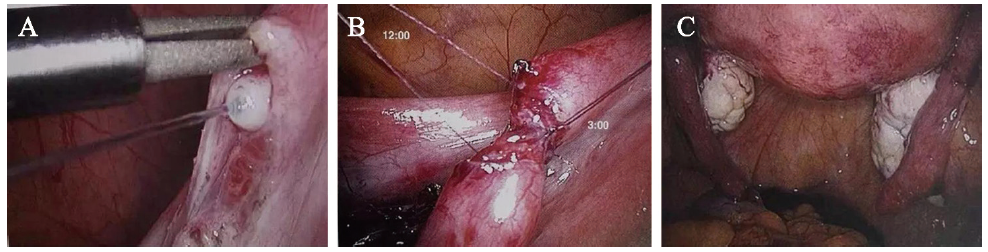 综合诸多临床研究,我科采用腹腔镜下输卵管吻合术,术中管腔的吻合在3、6、9、12四点进行对称缝合,既能保证管腔的闭合,又能减少更多缝线带来的异物反应