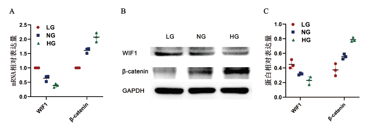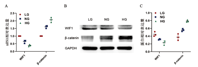 [5]。本研究结果显示,高糖抑制WIF1的表达和促进Wnt/β-catenin通路的活性可能与高糖促进细胞增殖有关。多项研究显示,WIF1在各系统肿瘤中表达降低,如口腔内膜鳞状细胞癌、鼻咽癌等,WIF1在各肿瘤中表达降低可能与其启动子甲基化有关