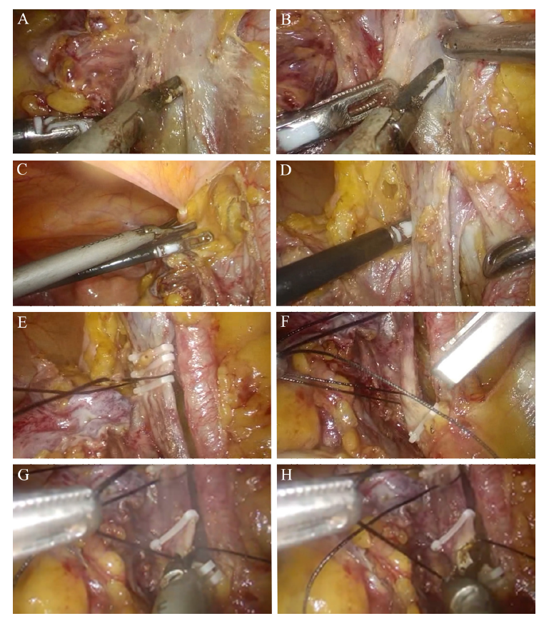 图1 下腔静脉节段性切除手术过程A:游离髂外静脉下缘;B:建立髂外动静脉之间平面;C:结扎并离断脐内侧韧带;D:游离远端髂外静脉下缘;E:结扎髂外静脉远端;F:结扎髂外静脉近端;G、H:节段性切除下腔静脉 |