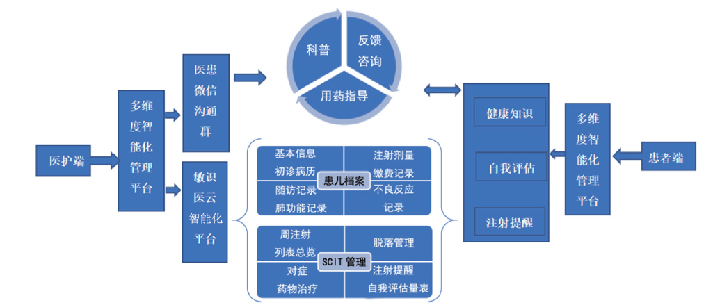 智能组采用多维度智能化平台进行干预,即在传统组的常规处理方案基础上增加2项内容:创建医患沟通微信群进行有效沟通及科普教育,使用敏识医云智能化平台进行智能管理及健康评估。①医患沟通微信群:a.成立微信干预小组,由专科医师和护士共同组成,共12名(6名医师及6名护士),以专科主任为组长,门诊护长为副组长,其他专科医师及专科护士为组员,对患儿实行微信干预。b.创建医患沟通群,患儿入组时其家属即加入医患沟通群,患儿及家属可在群内咨询与疾病及治疗相关的问题。医护人员根据患儿及家属提问热点每周在群内推送相关科普知识,如AR和(或)AS的疾病本质、发病原因、临床表现、诊断标准,螨过敏性疾病的治疗及干预,SCIT与药物治疗的区别和关系,SCIT的意义、疗程、不良反应和注意事项等,以此提高患儿及家属对疾病的认知和治疗的了解程度。c.医护职责分配,医师负责患儿的疗效评估及治疗方案调整,解答患儿关于治疗及不良反应等问题。护士负责定期了解患儿的心理状况,针对性地对患儿及家属进行鼓励和指导,帮助患儿克服无信心、畏惧、自卑等心理障碍;及时发现脱落情况并了解原因,强调治疗依从性的重要性;同时负责门诊挂号的指引及协调,提升就医体验。②敏识医云智能化平台:a.患儿入组时其家属通过扫描敏识医云智能化平台二维码注册并建立电子健康档案,医护人员指导患儿及家属了解该平台功能和使用方法。患儿及家属通过平台可以录入基本情况,快速查看治疗进度,预约治疗时间,记录不良反应,接收就诊预约通知、诊前诊后注意事项提醒以及科普推送。b.医护人员通过敏识医云智能化平台对患儿进行健康评估、预约管理、注射管理及过敏性疾病诊治科普等全程管理。患儿入组时,医护人员上传初诊病历、变应原检测结果等检查报告,并制定SCIT计划。就诊前1周,向患儿家属推送就诊提醒,并根据诊断向其发送症状评估量表,由患儿家属协助患儿完成自评。治疗前,医护人员再次进行问诊和体格检查,并核对不良反应发生情况。治疗结束后,患儿家属可直接预约下次就诊时间。对于未按时就诊的患儿,系统会启动脱落管理流程,同时提醒患儿家属及医护人员,及时进行干预,降低脱落率。多维度智能化平台方案流程见
