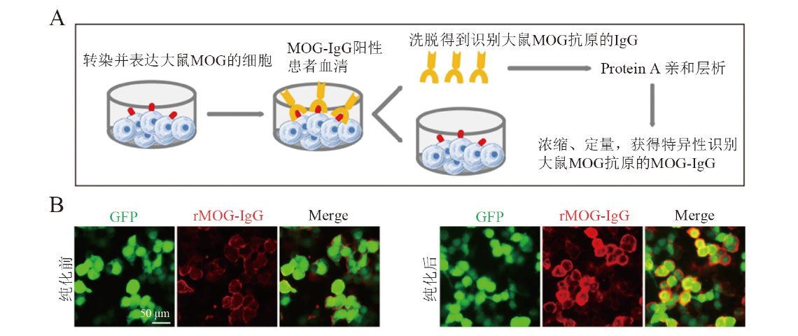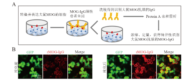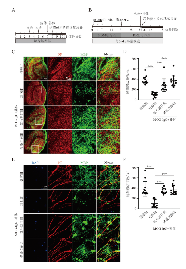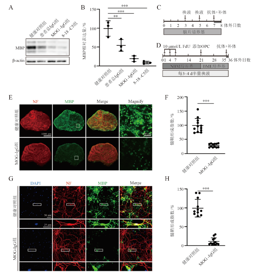 6.5 mg/mL D-葡萄糖、1%谷氨酰胺、1%青链霉素。 神经元培养基(NBM培养基):Neurobasal、2% B27、0.25%谷氨酰胺、0.5%青链霉素。神经元-少突胶质细胞(OL)共培养培养基(BME培养基):BME、1% ITS、0.5%胎牛血清、4.5 mg/mL D-葡萄糖、1%谷氨酰胺、0.5%青链霉素。Control-IgG (健康人血清总IgG,10 mg/mL),MOG-IgG(基于转染细胞的亲和层析方法获得的患者来源特异结合大鼠MOG的抗体,2.7 mg/mL),患者血清总IgG (识别大鼠MOG的患者血清总IgG,10 mg/mL),人源化8-18-C5单抗(100 μg/mL,该抗体的可变区序列由Markus Reindl教授馈赠),人补体。MBP抗体(Proteintech),β-actin抗体(Boster),NF抗体