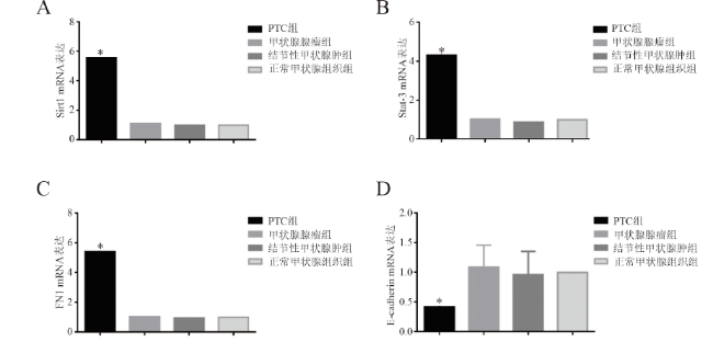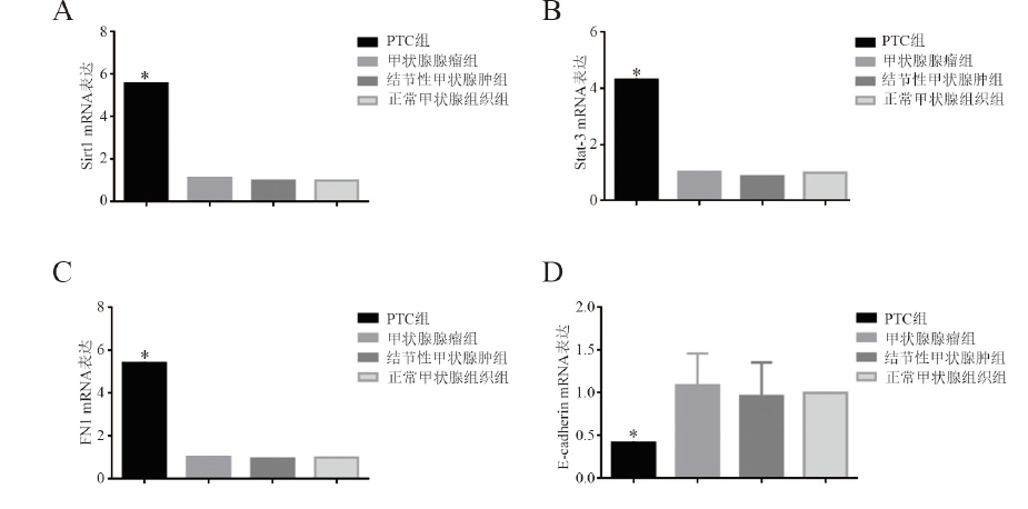 表1 Sirt1、Stat3、FN1以及E-cadherin mRNA的表达与PTC临床病理参数的关系(x±s) |