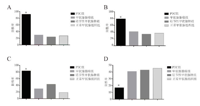 表4 Sirt1、Stat3、FN1以及E-cadherin单独检测对PTC的诊断价值 单位:% |