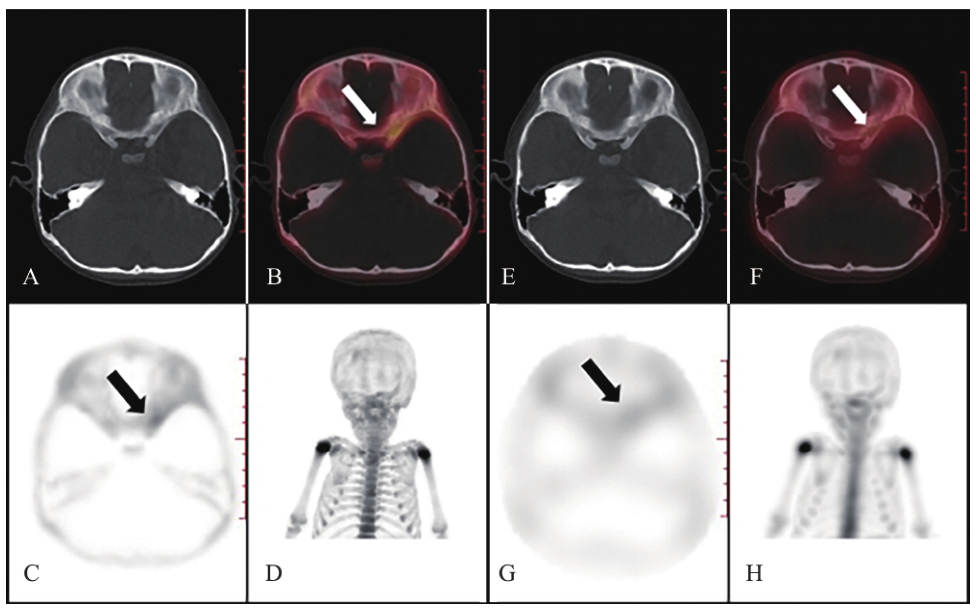 图1 一例骨转移瘤患儿xSPECT/CT与SPECT/CT系列图像的比较注:A~D为xSPECT/CT系列图像,A为CT图像,B为xSPECT/CT图像,C为xSPECT图像,D为xSPECT局部最大密度投影(MIP)图像;E~H为SPECT/CT系列图像,E为CT图像,F为SPECT/CT图像,G为SPECT图像,H为SPECT局部MIP图像。箭头所指最后被证实为骨转移病灶。xSPECT/CT图像质量相对较好,可清晰显示患儿左侧蝶骨局部放射性浓聚灶,而SPECT/CT图像质量相对差,在相同部位未见明确异常放射性浓聚。2名核医学医师对该例进行诊断时,在xSPECT/CT断层融合显像下,均明确患儿存在骨转移,诊断信心评分为4分;在SPECT/CT断层融合显像时,因未见明确放射性浓聚而漏诊,诊断信心评分为2分。 |