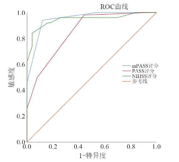 [11]亦认为言语具有重要的预测价值,他们采用凝视、面、臂、言语、时间(G-FAST)量表对急性前循环大动脉闭塞性脑卒中患者进行早期识别,并指出在条件允许时可考虑对G-FAST高分患者尽早实施血管内治疗。本研究将语言功能作为mPASS的子项目,并证实其具有预测大动脉闭塞性脑梗死的作用,与上述研究结果一致。在紧急情况下医护人员较易观察到“凝视”,但这在其他量表中未能体现,如动脉闭塞快速评价量表(RACE)、视力-失语-忽视量表(VAN)和卒中急诊评估及分类转运(FAST-ED)量表