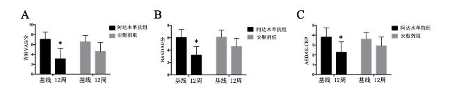 二、阿达木单抗组与安慰剂组成年活动性AS患者的临床疗效比较