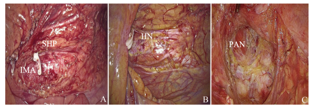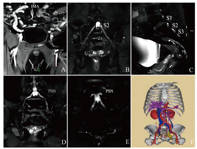 图1 基于盆腔MRI的盆腔自主神经及其相关器官的三维模型重建示例注:A为肠系膜下动脉及上腹下神经;B为S2神经;C为S1~S3骶椎神经节;D、E为盆内脏神经;F为盆腔自主神经三维重建图。SHP为下腹上丛(superior hypogastric plexus),IMA为肠系膜下神经丛(inferior mesenteric plexus),PSN为盆内脏神经(pelvic splanchnic nerves)。 Figure 1 The sample of the 3D reconstructions of pelvic autonomic nerves and their related organs based on MRI image |
