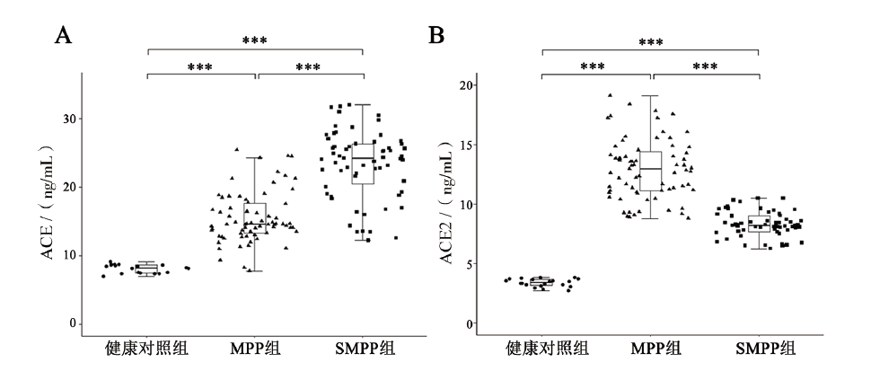 2.2 健康对照组、MPP组及SMPP组中血清ACE、ACE2质量浓度比较