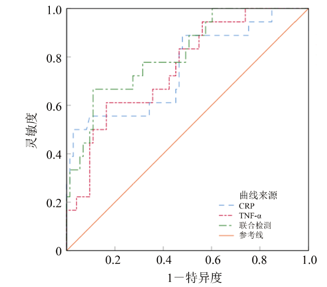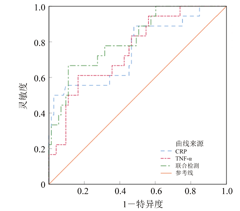图2 治疗前CRP、TNF-α预测COPD伴呼吸衰竭患者30 d再入院的ROC曲线Figure 2 ROC curve of CRP and TNF-α predicting 30 day readmission in COPD patients with respiratory failure before treatment |