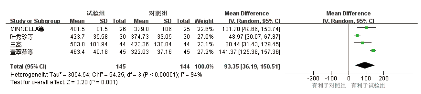 术后6MWD | 4 | 94% | <0.001 | 随机 | MD | 93.35 | 36.19~150.51 | 0.001 |